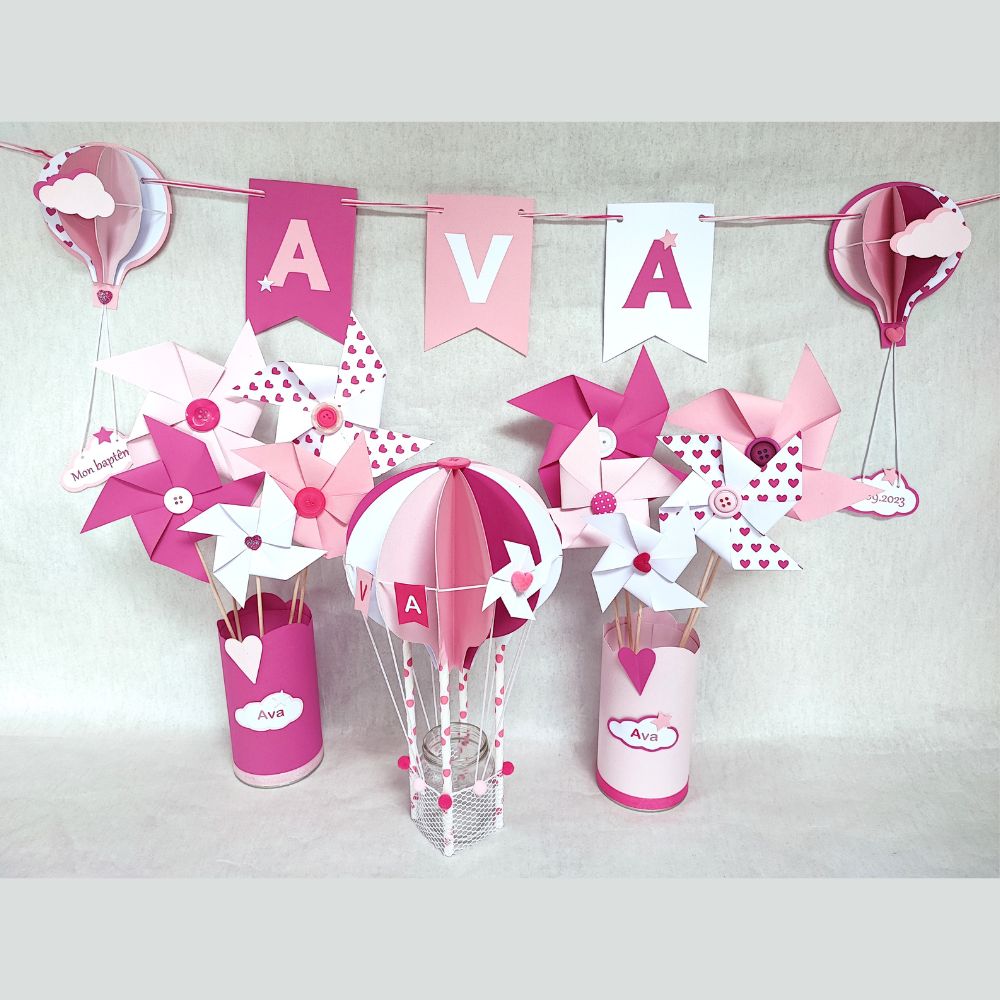 Décoration : fanions avec lettres du prénom, nuage avec la date du baptême, moulin à vent.